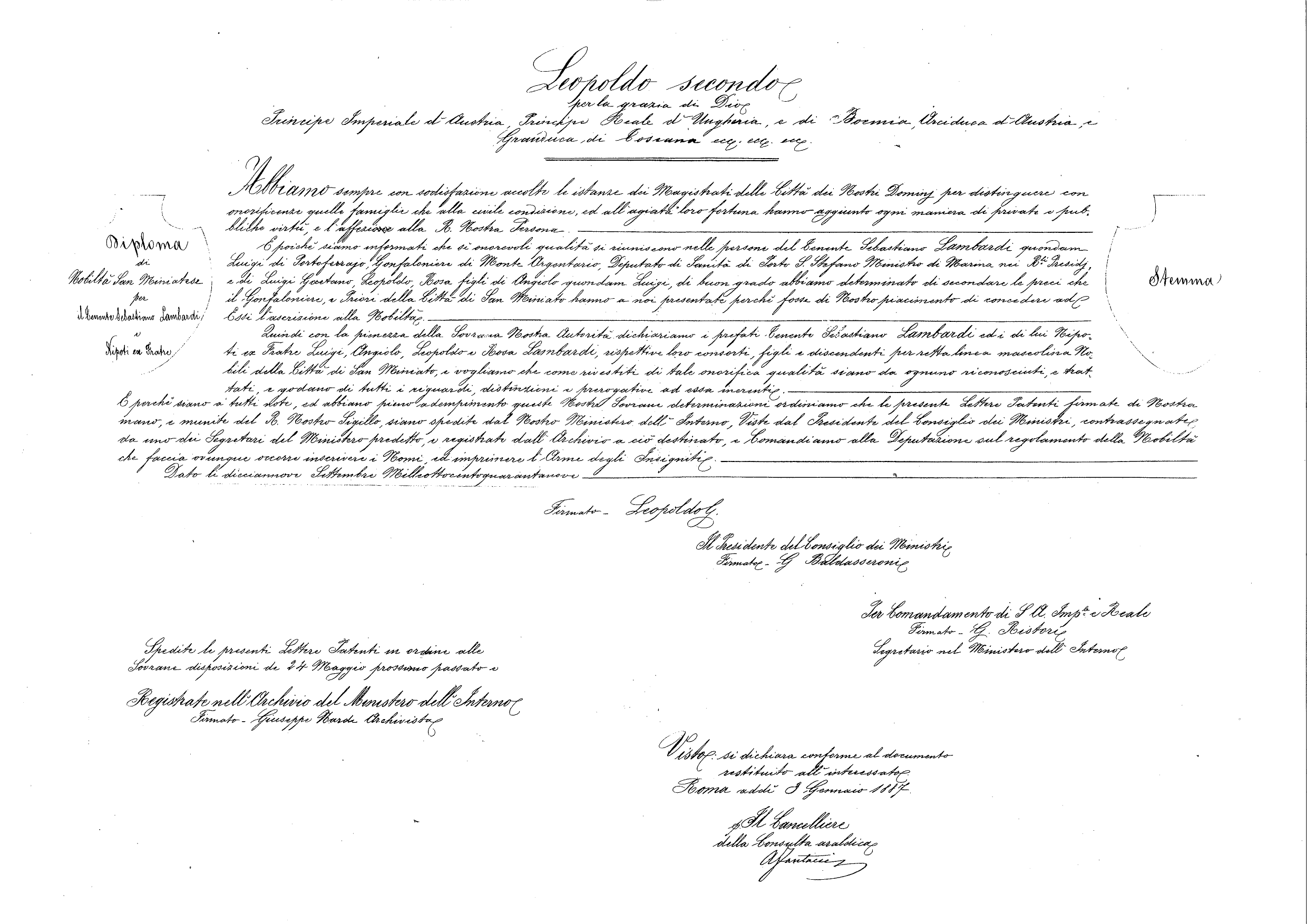 | Diploma di nobiltà San Miniatese per il tenente Sebastiano Lambardi e nipoti ex fratre | Certificate of nobility in San Miniato for lieutenant Sebastiano Lambardi and his nephews |